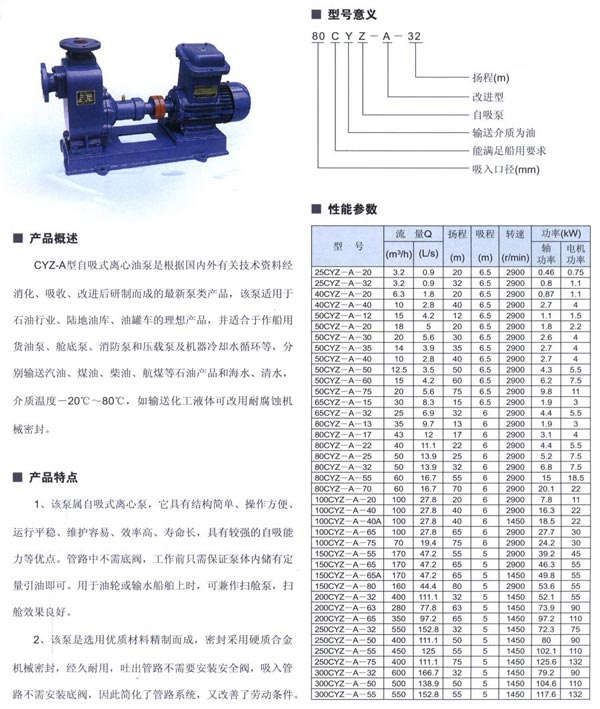 CYZ自吸離心油泵是根據(jù)國內(nèi)外有關(guān)技術(shù)資料經(jīng)消化、吸收、改進(jìn)后研制而成的新泵類產(chǎn)品,該泵適用于石油行業(yè)、陸地油庫、油罐車的理想產(chǎn)品,并適合于作船用貨油泵、艙底泵、消防泵和壓載泵及機(jī)器冷卻水循環(huán)等,分別輸送汽油、煤油、柴油、航煤等石油產(chǎn)品和海水、清水,介質(zhì)溫度-20℃-80℃,如輸送化工液體可改用耐腐蝕機(jī)械密封。